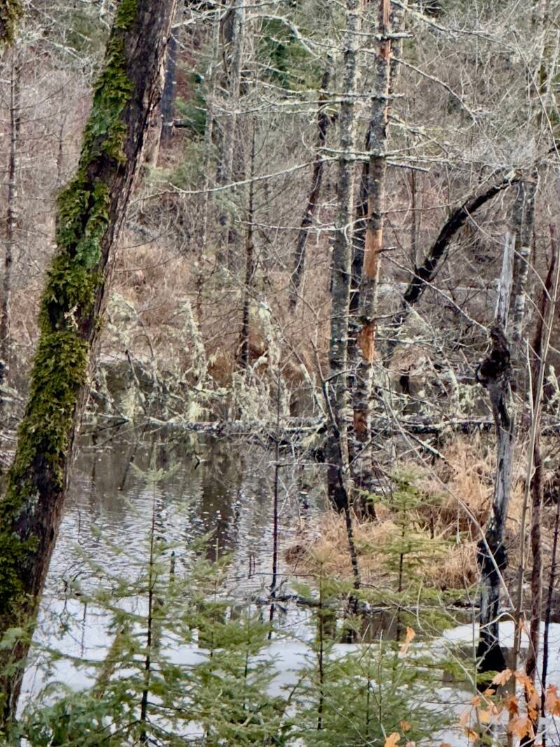 While you are thinking about the trumpet, the stream feeding the beaver pond flows freely making ripples like a breeze. It could be a spring morning. The sun shone briefly; not long enough to paint designs on the plaster woman. Not long enough to cast shadow windows on interior walls; not long enough to dry drops clinging to the fence or to make them fall.
