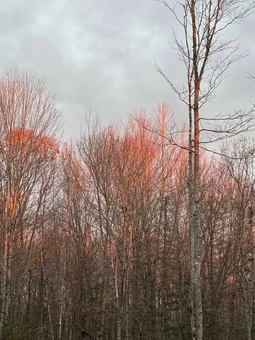 Soleil settles orange skirts across the eastern sky as if she intends to stay. She turns treetops red, hurries away. Zsolt races to see if there’s anything to bark, remains quiet. One step closer to the railing, slippery. Time to be careful of frosted mornings. Steam has stopped rising from my cup. We can see our breath. Through the trees violet blue sky, bands of white.