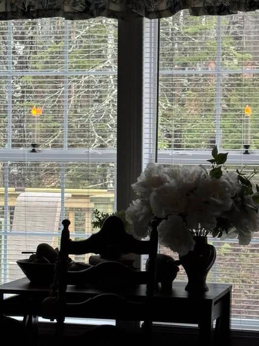 Something furry like a man’s winter hat, glimpsed through the window. Chris wasn’t wearing that, wouldn’t wear that. Who’s walking in the yard? Why did no dogs bark? As I slide the door, a plump gray squirrel inspecting a Tiki Torch jumps from the railing. I hope he is long away from our fenced-in-land.