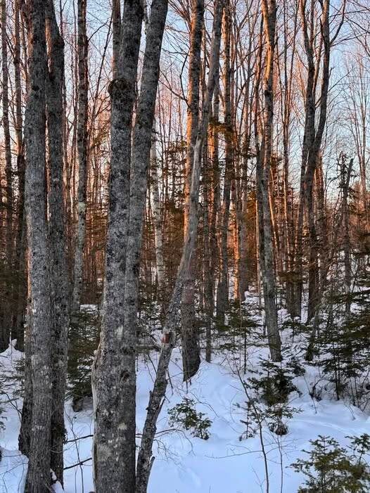The three venture past their scraped-out-place into compacted snow covering their feet. Forgot to look for the moon. Soleil showers trees in orange light making her way up the hill not interested in animal paths or following.