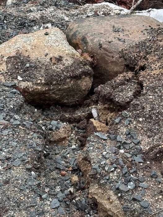 I return without the three to survey: one, two, perhaps three washed out places, one I can’t walk to, all along the stacked boulders securing this built-up land. Harmony to wind, water rushes. Rooster crows. Snow blocks path to stream. I don’t want to feed the ticks today. I go inside.